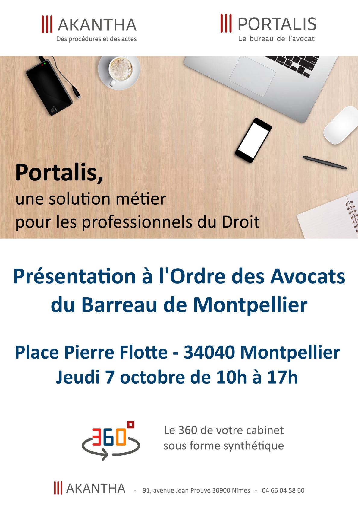 Akantha sera présent au Barreau de Montpellier le 7 octobre de 10h à 17h. En particulier, Akantha y présentera sa solution Portalis et ses outils de gestion des procédures juridiques.Vous avez une question sur ce sujet ?