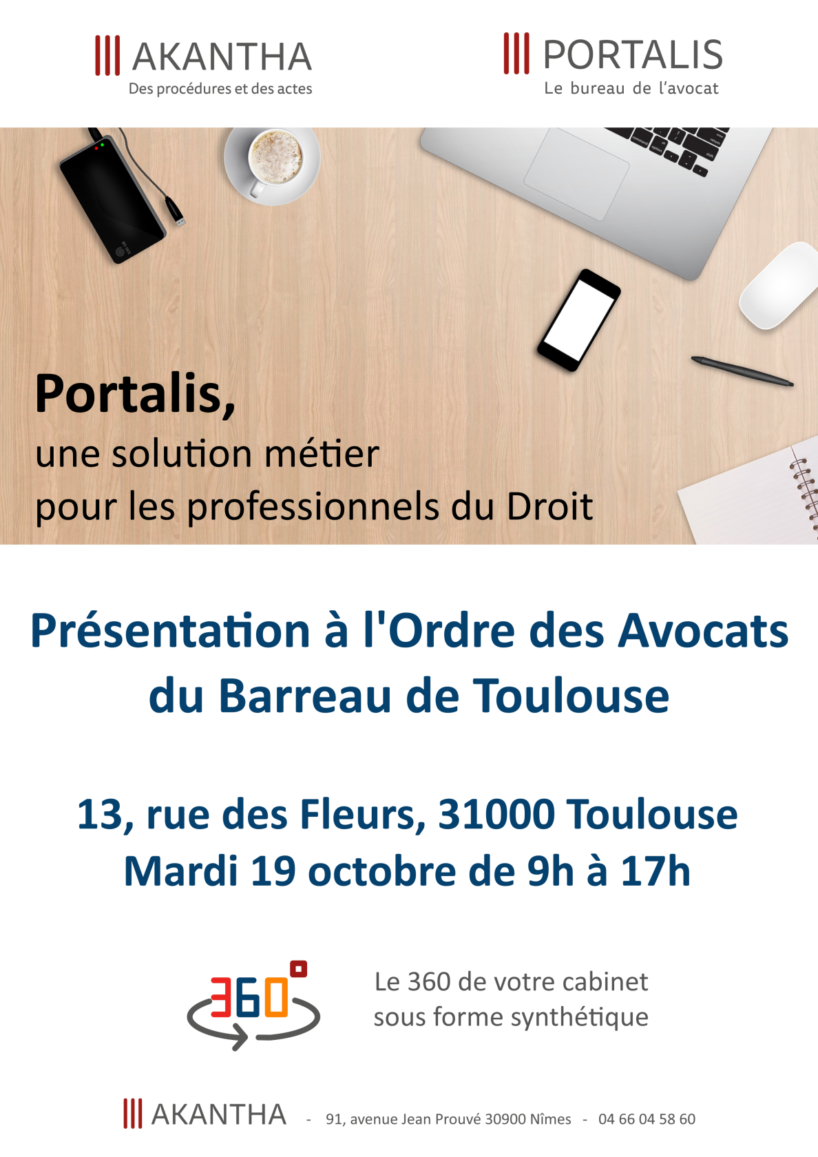 Akantha sera présent au Barreau de Toulouse le 19 octobre de 9h à 17h. En particulier, Akantha y présentera sa solution Portalis et ses outils de gestion des procédures juridiques.Vous avez une question sur ce sujet ?
