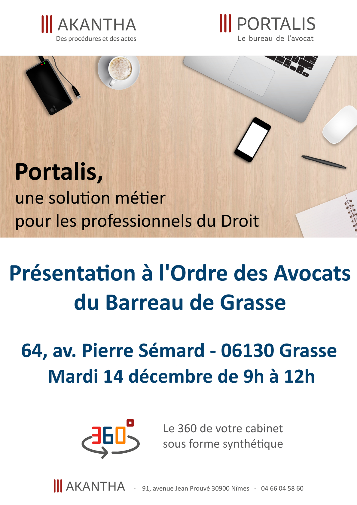 Akantha sera présent au Barreau de Grasse le 14 décembre de 9h à 12h. En particulier, Akantha y présentera sa solution Portalis et ses outils de gestion des procédures juridiques.Vous avez une question sur ce sujet ?